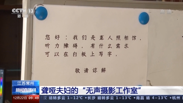 走进这家摄影工作室,门口右手边有一块白色留言板,上面写着:您好,我们是聋人照相馆,听力障碍,有什么要求,可以在白板上写字,敬请谅解。摄影工作室的老板是杨斌和韩沙沙。