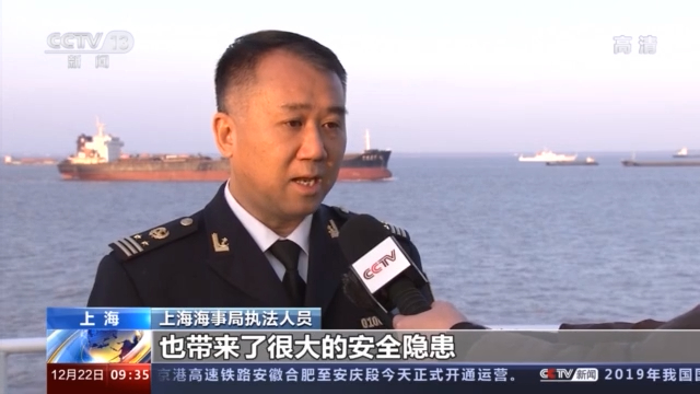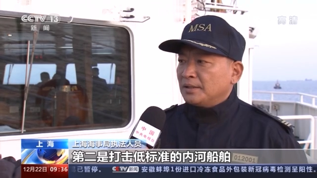 上海海事局执法人员:主要的目的一是遏制内河船非法从事海上运输的势头,第二是打击低标准的内河船舶,来提升我们整个上海港口水域的安全度。