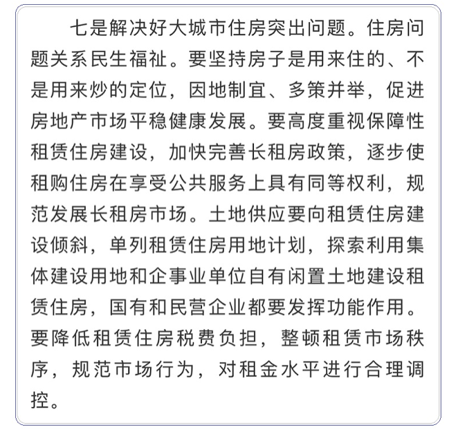 本次会议强调:降低租赁住房的税费负担,整顿租赁市场秩序,规范市场行为,对租金水平进行合理调控。