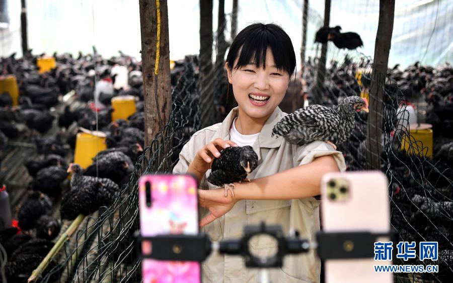 7月20日,陕西商洛市丹凤县寺坪镇寺坪村的网络主播李萌在直播介绍自家养的芦花鸡。