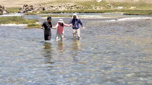 跨过雪山下小河对记者是个挑战