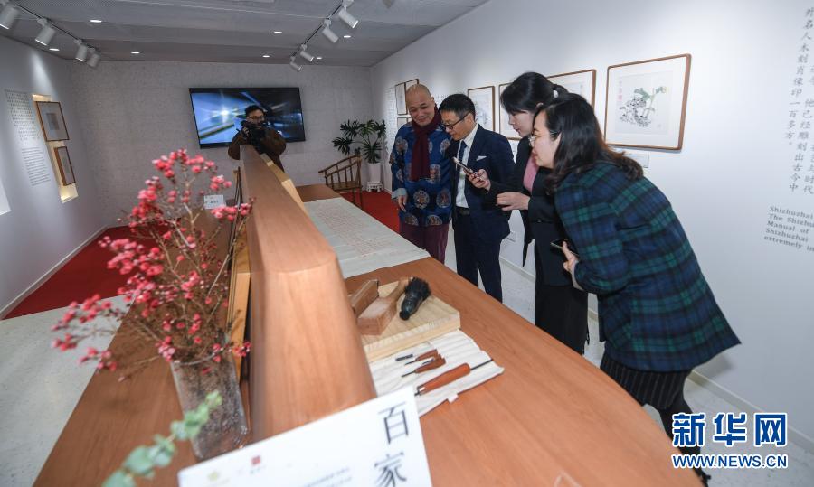 12月22日,在位于杭州高银街的“木版水印”非遗新馆,国家级非物质文化遗产代表性传承人、杭州十竹斋艺术馆馆长魏立中(右四)向嘉宾介绍木版水印作品。
