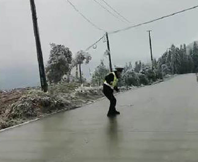 12月17日以来,宣威市普立乡气温骤降至零下4摄氏度,辖区高海拔路段、迎风坡、背阴坡等路段出现不同程度的道路结冰现象,严重影响交通正常通行。12月20日14时许,宣威市公安局普立派出所接到群众报警称,因路面湿滑,车辆侧滑在路边沟渠中,请派出所救助。接到报警后,普立派出所民警叶远孔带领辅警立即赶到现场救助。因路面结冰严重,叶远孔刚下车在猝不及防的状况下滑行了10余米后摔倒在地,幸好人没有受伤。