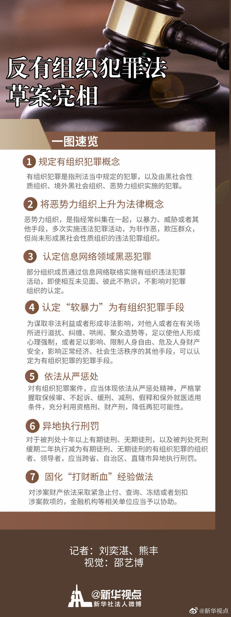 22日,反有组织犯罪法草案首次提请全国人大常委会会议审议。为预防和惩治有组织犯罪,草案作出哪些规定?如何提升扫黑除恶法治化、规范化水平?戳图速览↓