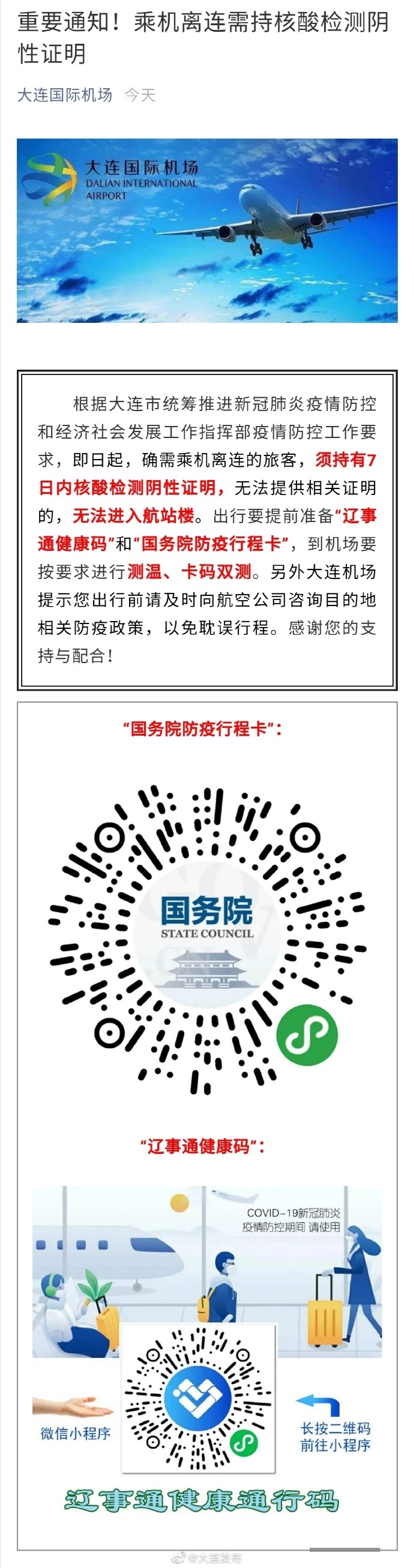 根据大连市统筹推进新冠肺炎疫情防控和经济社会发展工作指挥部疫情防控工作要求,即日起,确需乘机离连的旅客,须持有7日内核酸检测阴性证明,无法提供相关证明的,无法进入航站楼。出行要提前准备“辽事通健康码”和“国务院防疫行程卡”,到机场要按要求进行测温、卡码双测。另外大连机场提示您出行前请及时向航空公司咨询目的地相关防疫政策,以免耽误行程。