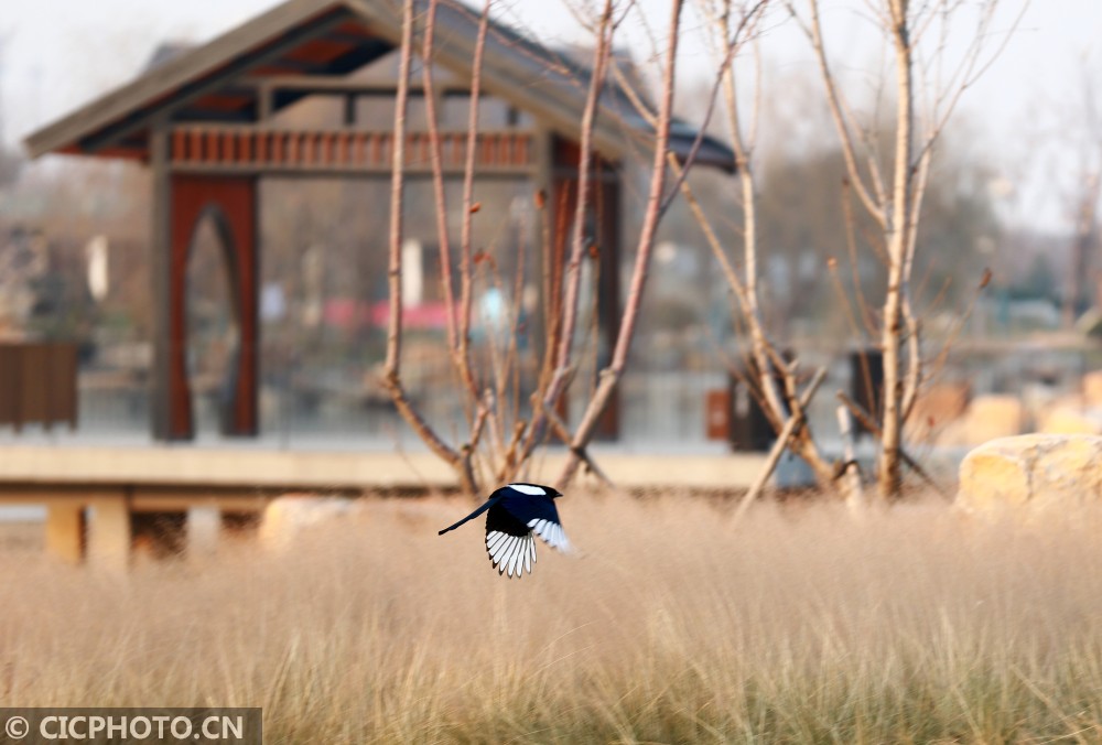 ↑2020年12月21日,在河北省邢台市园博园,飞翔的鸟儿和仿古建筑呈现出一幅和谐的画面。CICPHOTO/柴更利 摄
