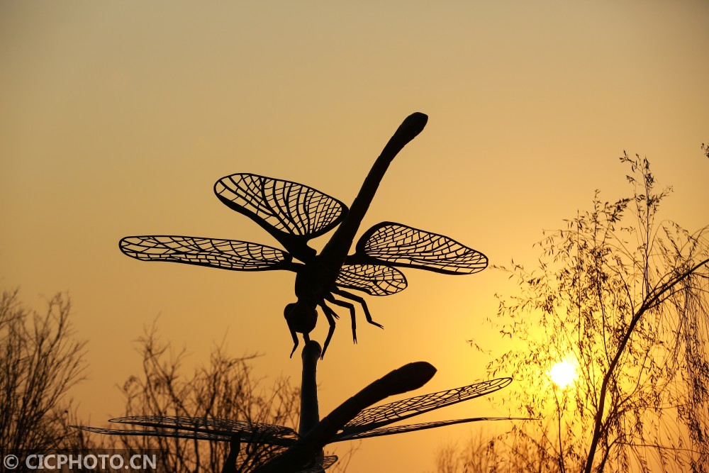 ↑2020年12月21日,在河北省邢台市园博园,夕阳下的蜻蜓雕塑格外美丽。CICPHOTO/柴更利 摄