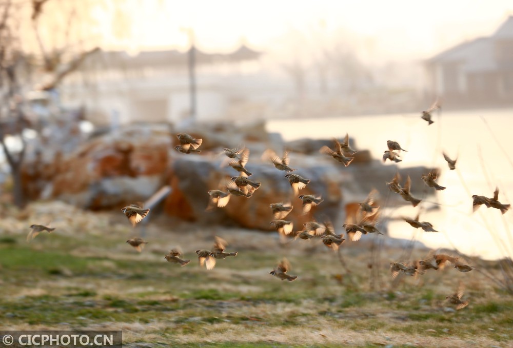 ↑2020年12月21日,在河北省邢台市园博园,一群鸟儿在湖边飞翔。CICPHOTO/柴更利 摄
