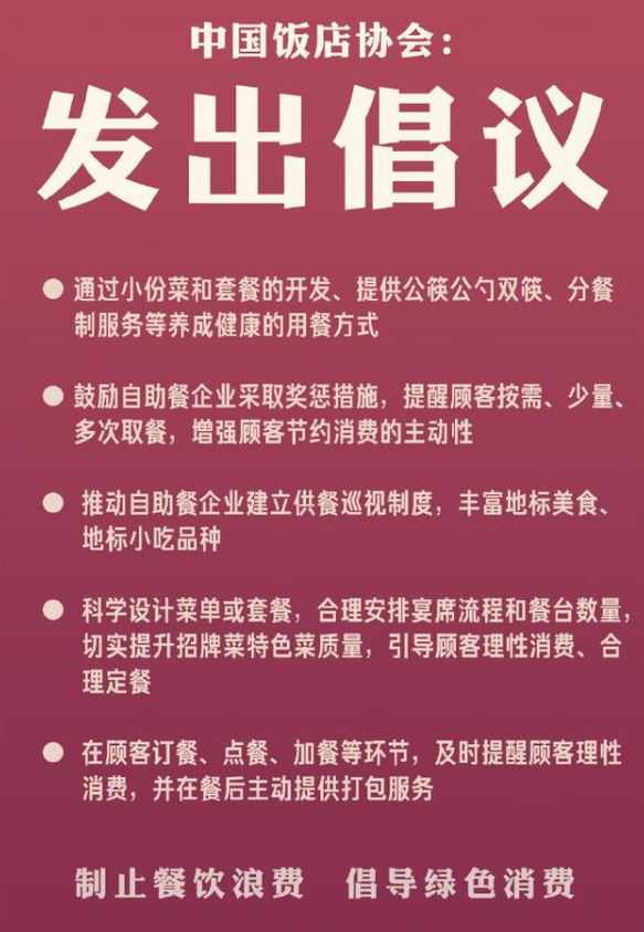 北京烹饪协会、北京市餐饮行业协会向全市餐饮行业和广大消费者发出倡议。提倡绿色消费,珍惜粮食,注重膳食均衡,合理搭配菜品,不误导消费者超量点餐,倡议餐饮企业提供“半份、半价”“小份、适价”服务方式,倡导“光盘行动”;带头不使用一次性餐具,提供环保打包服务。