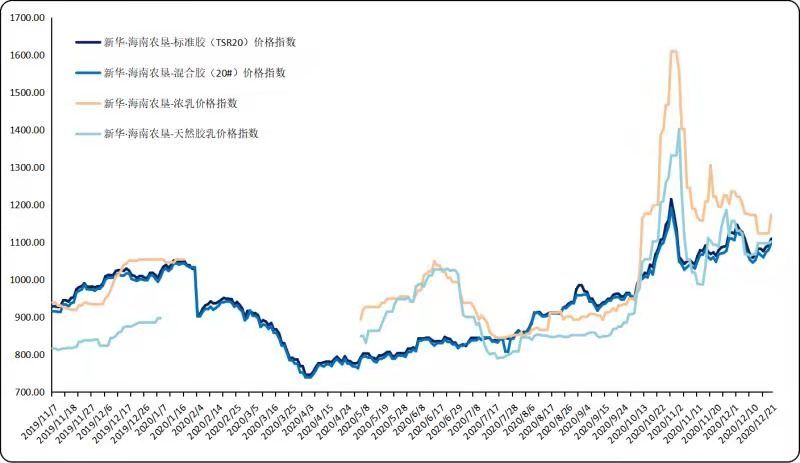 新华·海南农垦-天然橡胶系列价格指数显示,截至12月21日,标准胶(TSR20)价格指数报1108.95点,较12月14日(下同)上涨2.44%;混合胶(20#)价格指数报1097.22点,上涨2.33%。新华·海南农垦-浓乳价格指数报1172.45点,上涨4.36%;新华·海南农垦-天然胶乳价格指数报1101.56点,上涨0.37%。