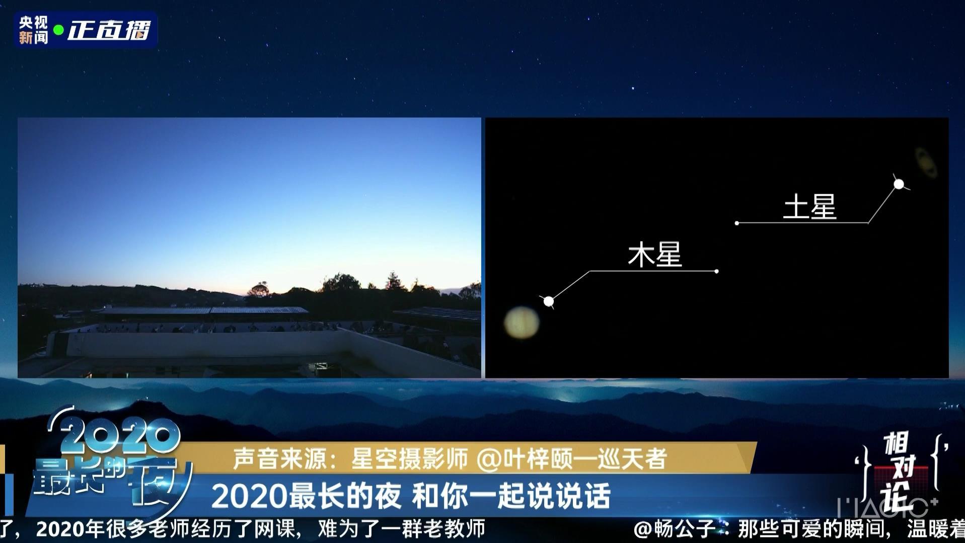 昨晚冬至,我们迎来近400年一遇的土木“相合”最近一次。这是1623年以来土星和木星最近的时刻,角距离只有0.1度。央视新闻《相对论》年终特别节目记录了这一瞬间。