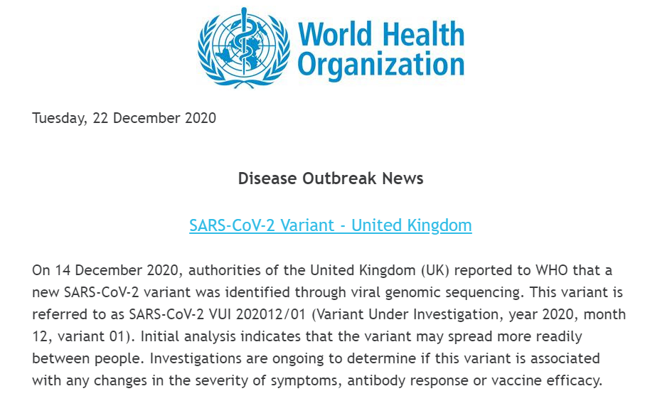 当地时间22日,世卫组织发布英国上报的有关变异新冠病毒的相关信息。12月14日,英国向世卫组织报告,通过病毒基因测序发现一种新的新冠病毒变体。初步分析表明,该变体更易在人与人之间传播,估计传染性增加40%-70%,传播指数增加0.4在1.5-1.7之间。截至12月13日,英国共检出1108例感染了该变异病毒的病例。