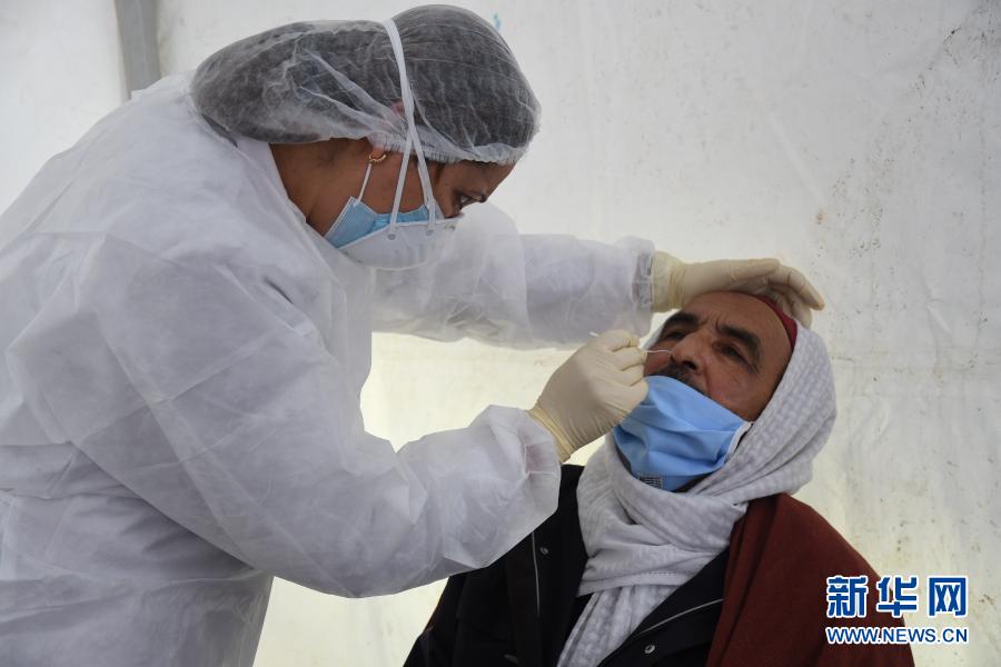 12月21日,在突尼斯首都突尼斯市,医护人员对市民进行新冠病毒检测取样。