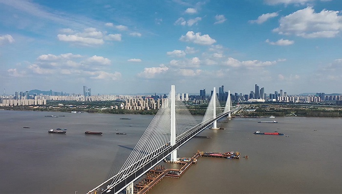 江心洲长江大桥(长江五桥),是世界上首座钢混组合索塔斜拉桥,东连江山大街隧道,西接宁合高速五里桥互通,双向6车道,全长10.3公里,包括4.4公里的主汊跨江大桥、1.8公里的夹江隧道(梅子洲隧道)以及4.1公里两岸连接线。