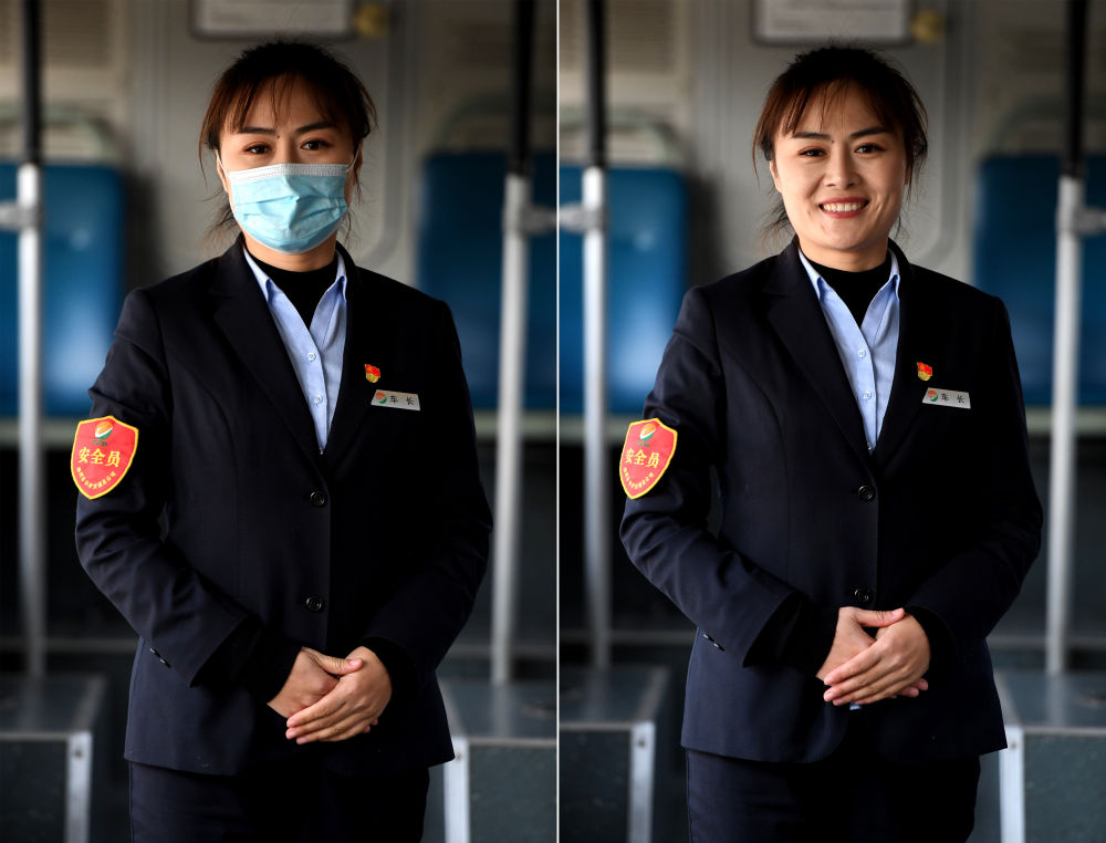 这是12月18日拍摄的郑州公交二公司B38路公交车车长黄菲肖像(拼版照片)。