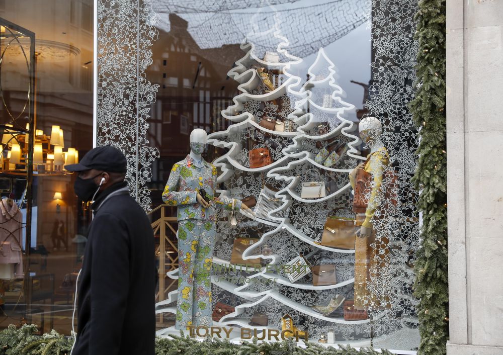 12月21日,一名戴口罩的男子从英国伦敦一家商铺橱窗里戴口罩的模特前走过。新华社记者韩岩摄