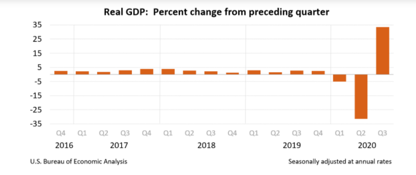 分析认为,理解美国第三季度GDP大幅反弹的背景,需要考虑第二季度GDP暴跌31.4%的事实,这是1947年开始记录季度GDP数据以来的最大跌幅。随着第四季度疫情再度恶化,各地陆续出台商业限制措施,本已缓慢复苏的消费和就业市场再度受到冲击,经济形势不容乐观。