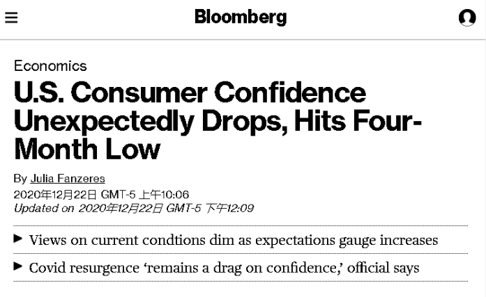 与此同时,世界大型企业研究会22日发布数据显示,美国12月消费者信心指数降至88.6,创今年8月以来最低水平,进一步预示着消费导向型的美国经济前景不容乐观。为了支持充满不确定性的经济复苏,美国国会终于通过了新一轮纾困法案,但却因为力度有限遭到了广泛批评。而最新批评纾困法案的,竟是美国总统特朗普,他的表态也引发了外界对他可能不会签署纾困法案的猜测。