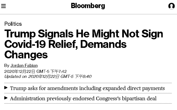 △彭博社称,特朗普有可能不会签署纾困法案,呼吁提高纾困力度