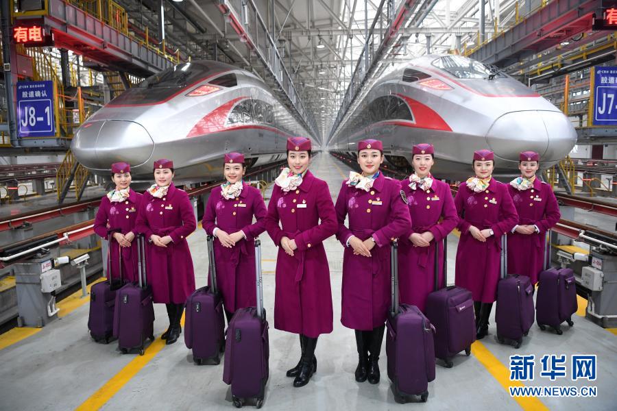 12月23日,复兴号CR400AF动车组及首发乘务组在重庆车辆段西动车所亮相。新华社记者 唐奕 摄