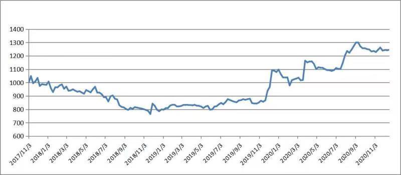 12月18日,指数报1245.03点,较上期(12.7-12.13,下同)上涨4.07点,涨幅0.33%,与基期相比上涨245.03点,涨幅24.50%。