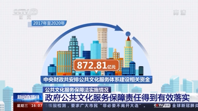 报告指出,公共文化服务保障法实施取得明显成效,政府公共文化服务保障责任得到有效落实,2017年至2020年,中央财政共安排公共文化服务体系建设相关资金872.81亿元,其中2020年安排232.14亿元,比2019年增加7.08亿元。
