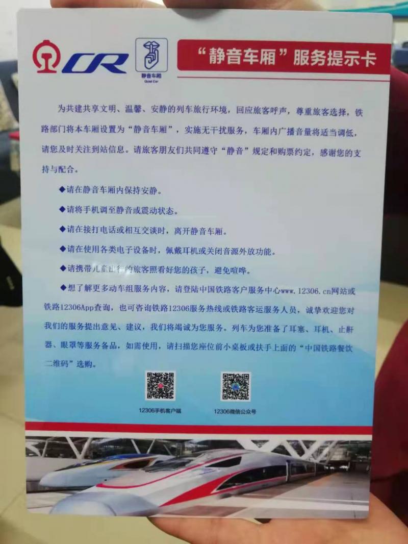 首先,车厢内将设置“静音车厢”提示标识和服务提示卡,方便旅客了解自己的位置,同时也能够更清楚了解自己所能享受到的服务。