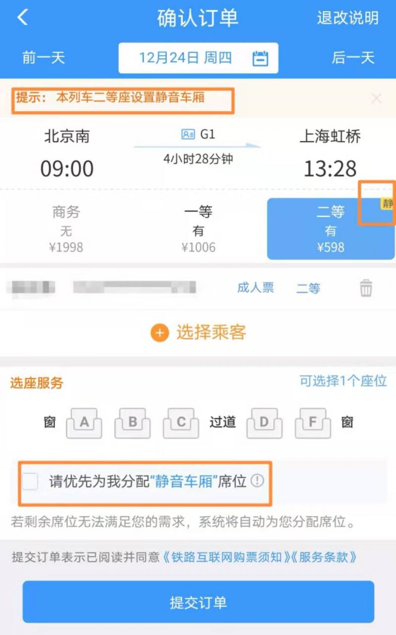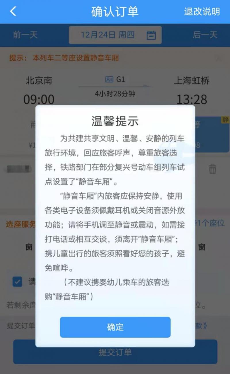 今天,北青-北京头条记者登录铁路12306手机App,尝试购买24日试点列车——京沪高铁G1次列车——车票,在提交订单前,除了传统的“选座选项”外会提示该趟列车设有“静音车厢”。