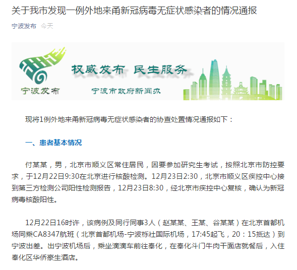 12月22日16时许,该病例及同行同事3人(赵某某、王某、谷某某)在北京首都机场同乘CA8347航班(北京首都机场-宁波栎社国际机场,17:45起飞,20:15抵达)到宁波出差。出宁波机场后,乘坐滴滴车前往奉化,在奉化斗门牛肉干面店就餐后,入住奉化区华侨豪生酒店。