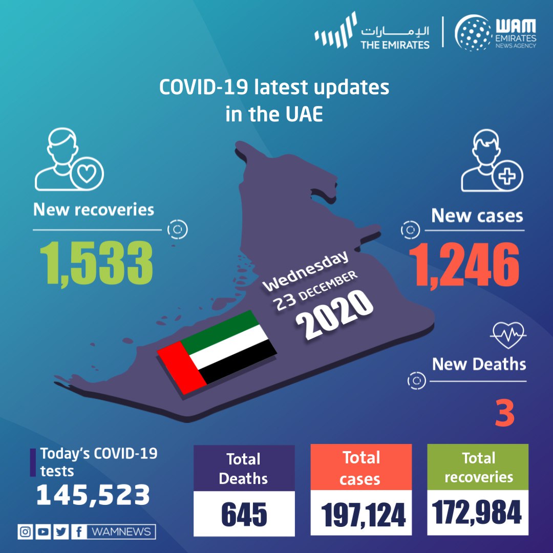 当地时间12月23日,阿联酋卫生和预防部通报该国新增1246例新冠肺炎确诊病例,同时新增1533例治愈病例,新增3例死亡病例。阿联酋境内新冠肺炎累计确诊病例达197124例,其中治愈病例172984例,死亡病例645例。