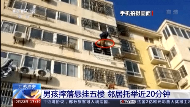 近日,江苏淮安涟水县一名12岁男孩,在收晾晒的被子时,不小心从6楼阳台摔下,坠落在5楼阳台外的晾衣架上,危急时刻,热心邻居爬出阳台,全力托举他近20分钟,等待救援。