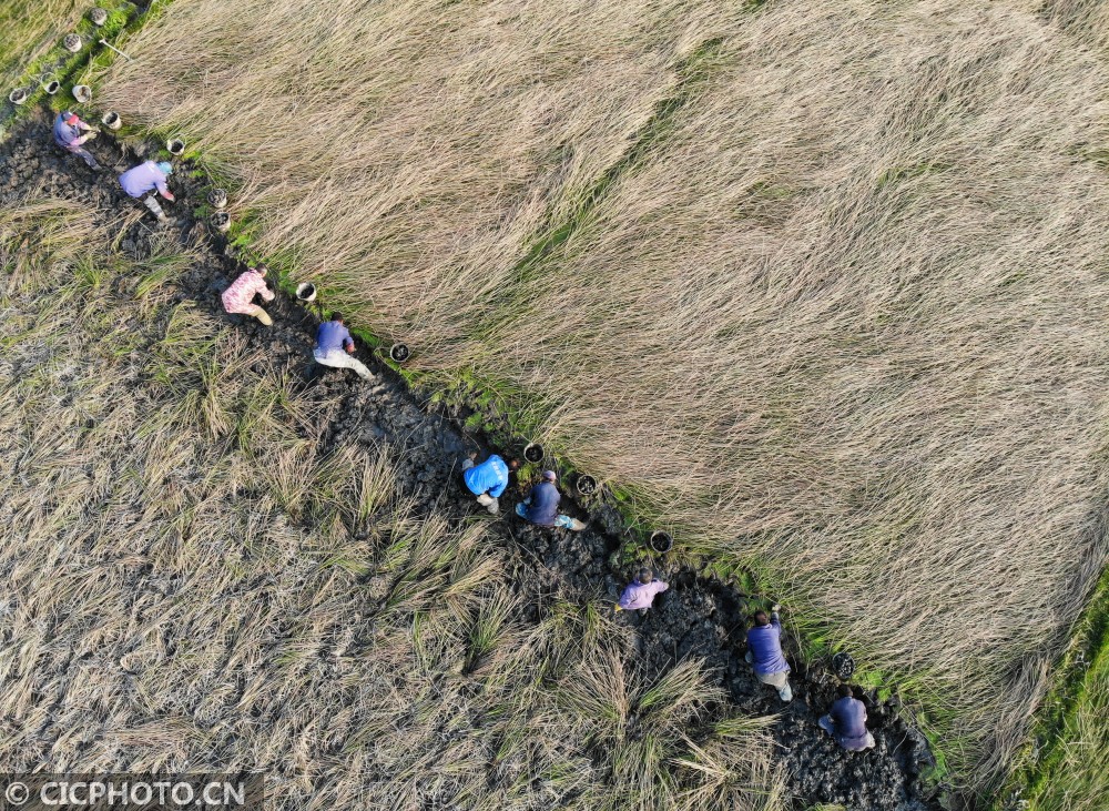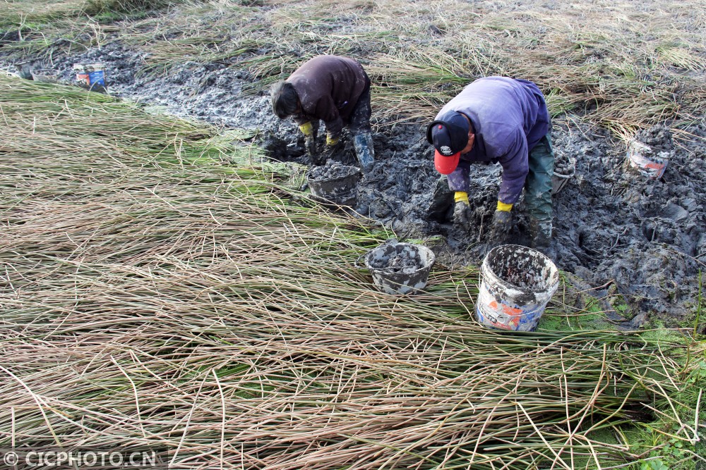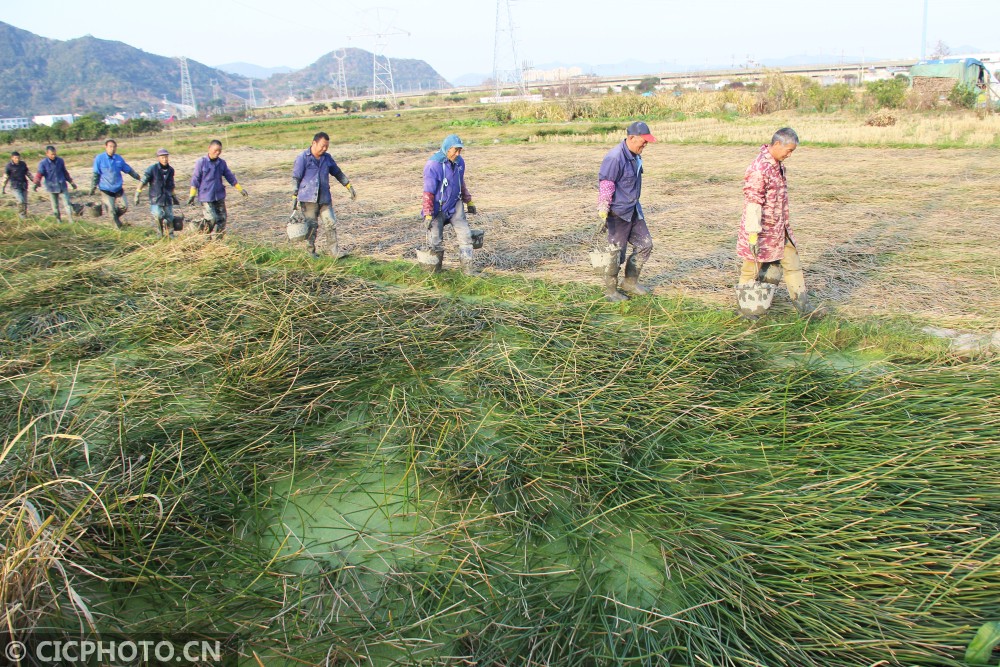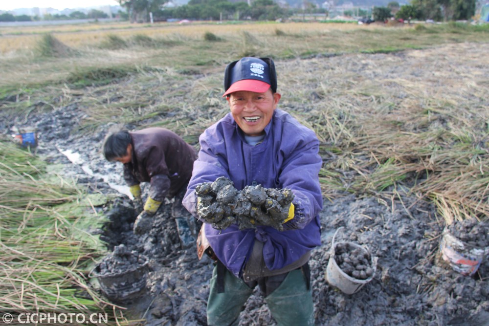 ↑2020年12月22日,浙江省台州市路桥区螺洋街道车头村村民在田间采挖荸荠。CICPHOTO/蒋友亲 摄