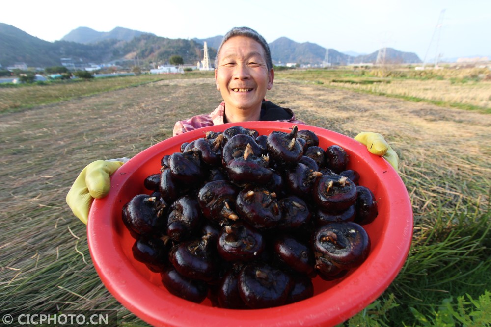 ↑2020年12月22日,浙江省台州市路桥区螺洋街道车头村村民在田间展示刚采挖的荸荠。CICPHOTO/蒋友亲 摄