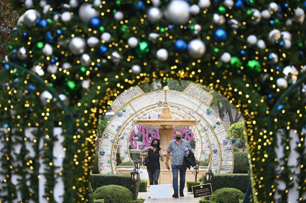 2020年11月23日,人们从美国洛杉矶贝弗利山的圣诞新年装饰前走过。(新华社/法新)