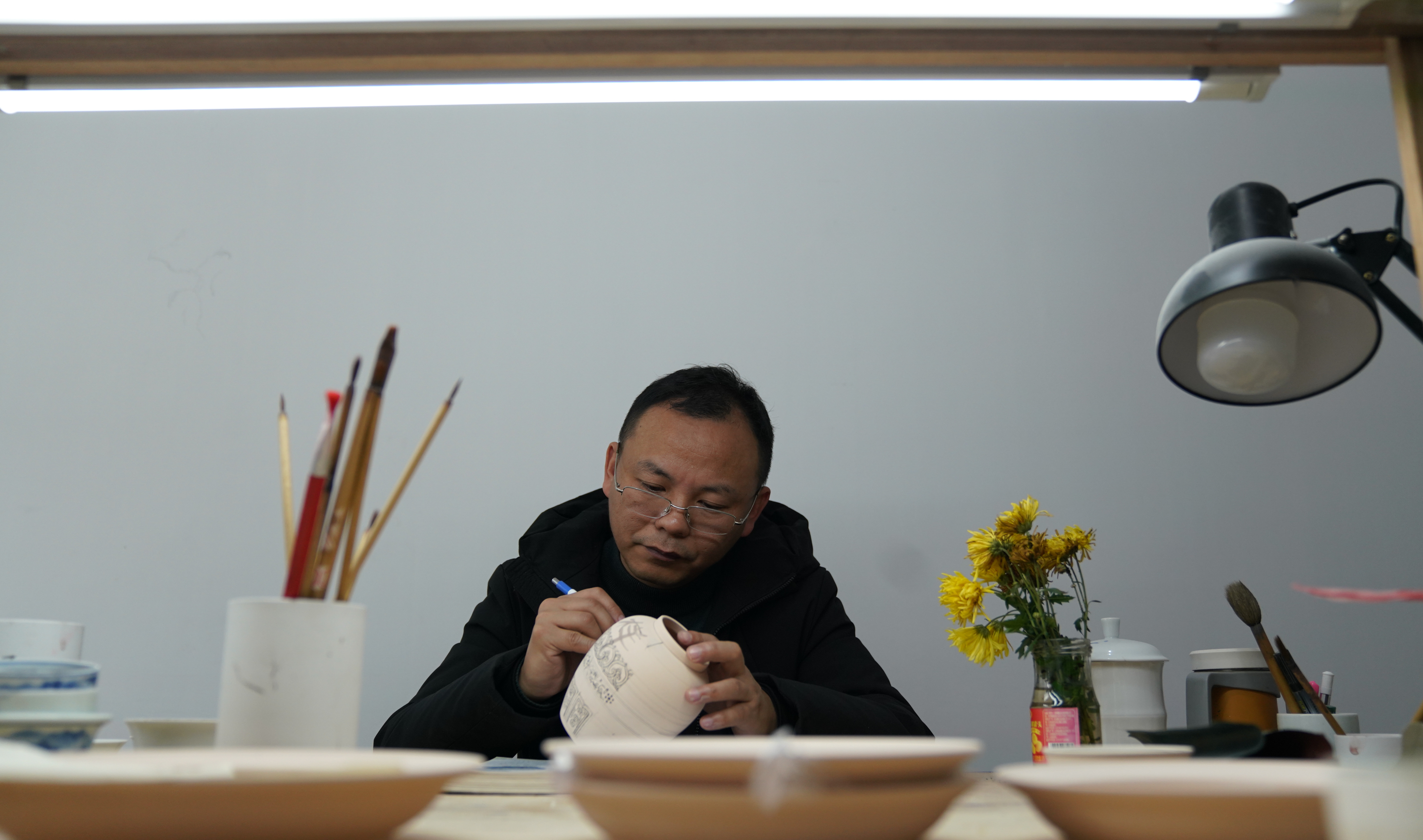 ↑12月23日,“快雪时晴”团队成员在工作室进行陶瓷绘画。新华社记者 胡晨欢 摄