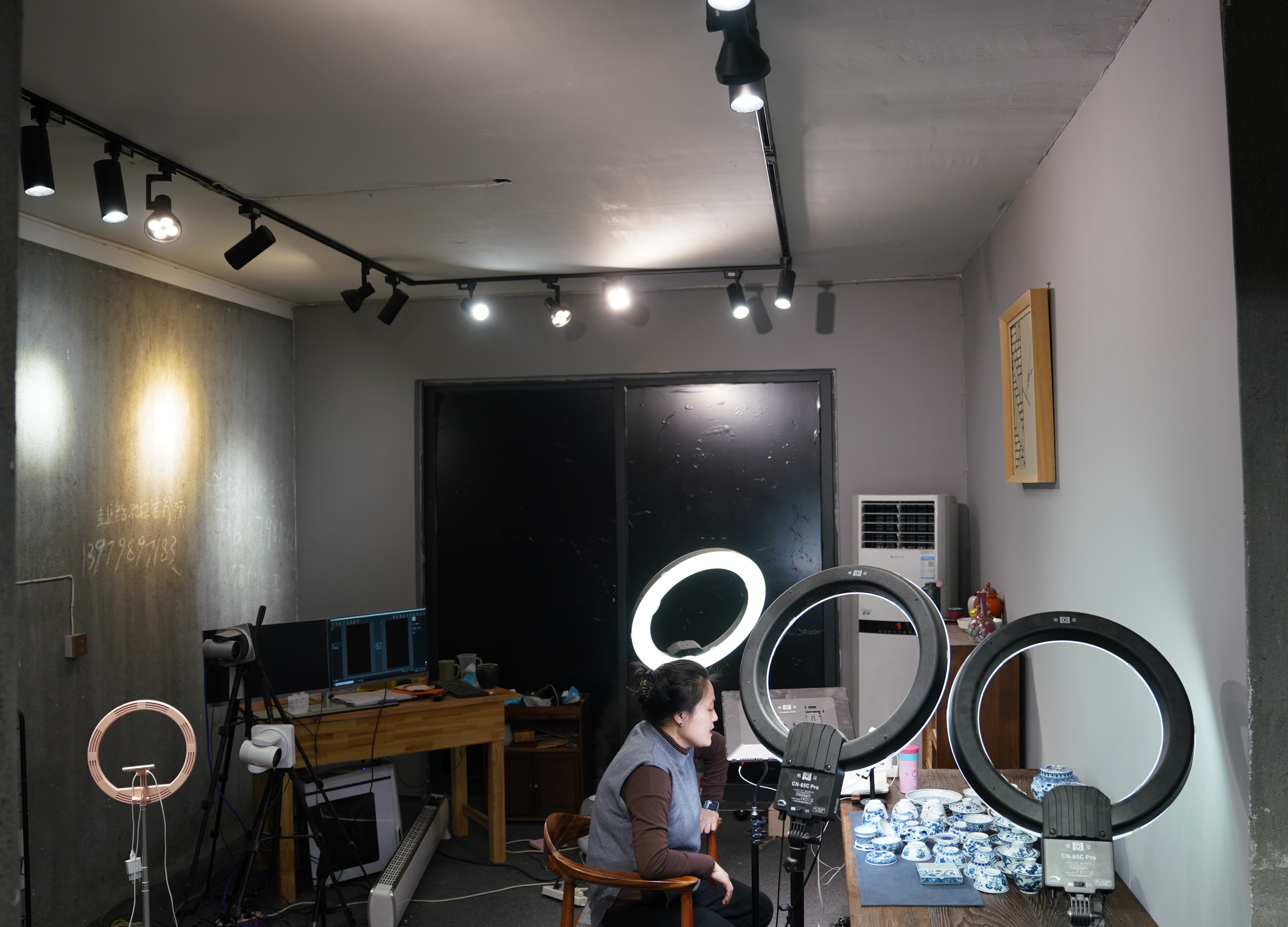 ↑12月22日,“快雪时晴”团队成员在工作室通过互联网直播销售陶瓷。新华社记者 胡晨欢 摄