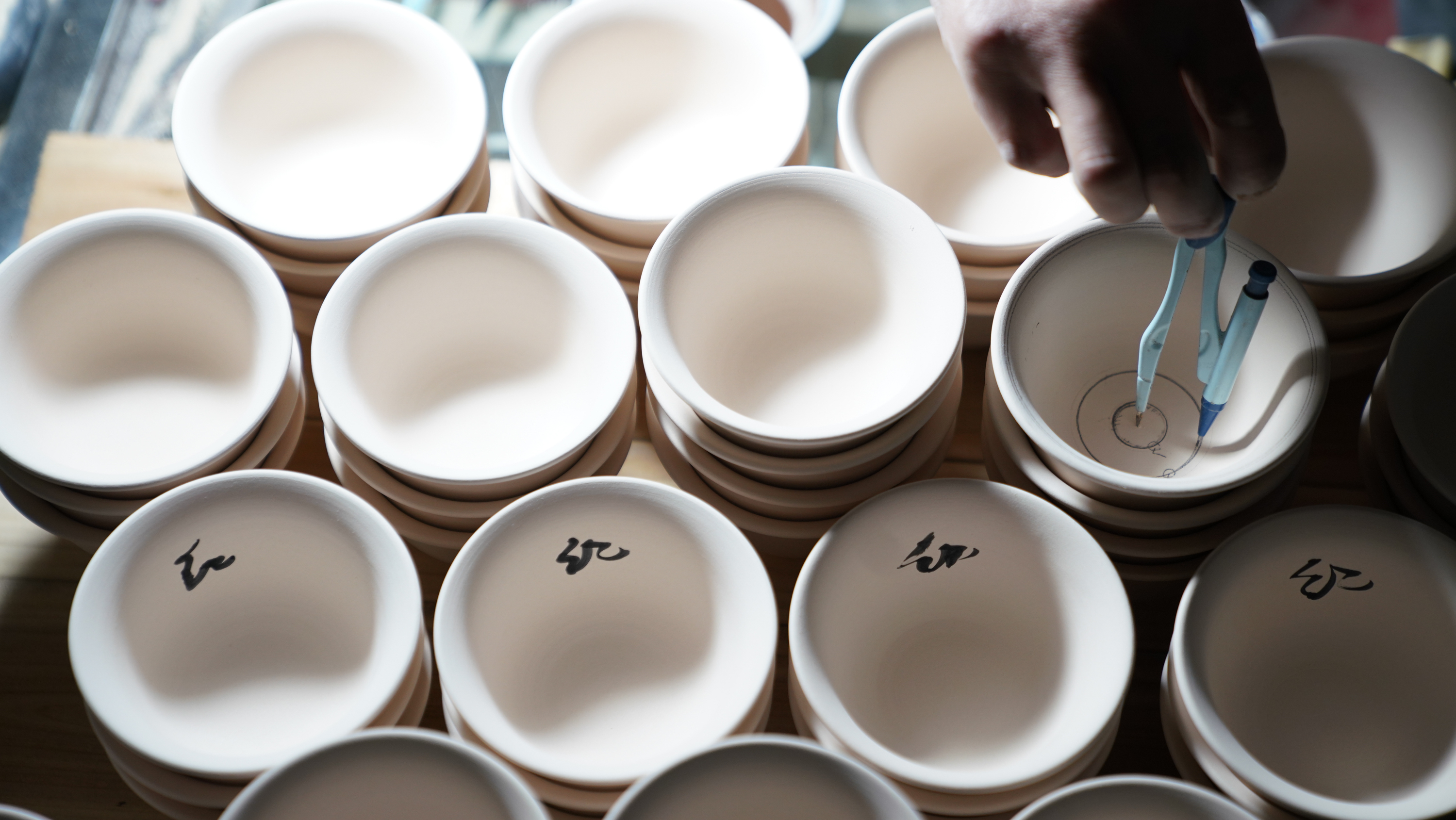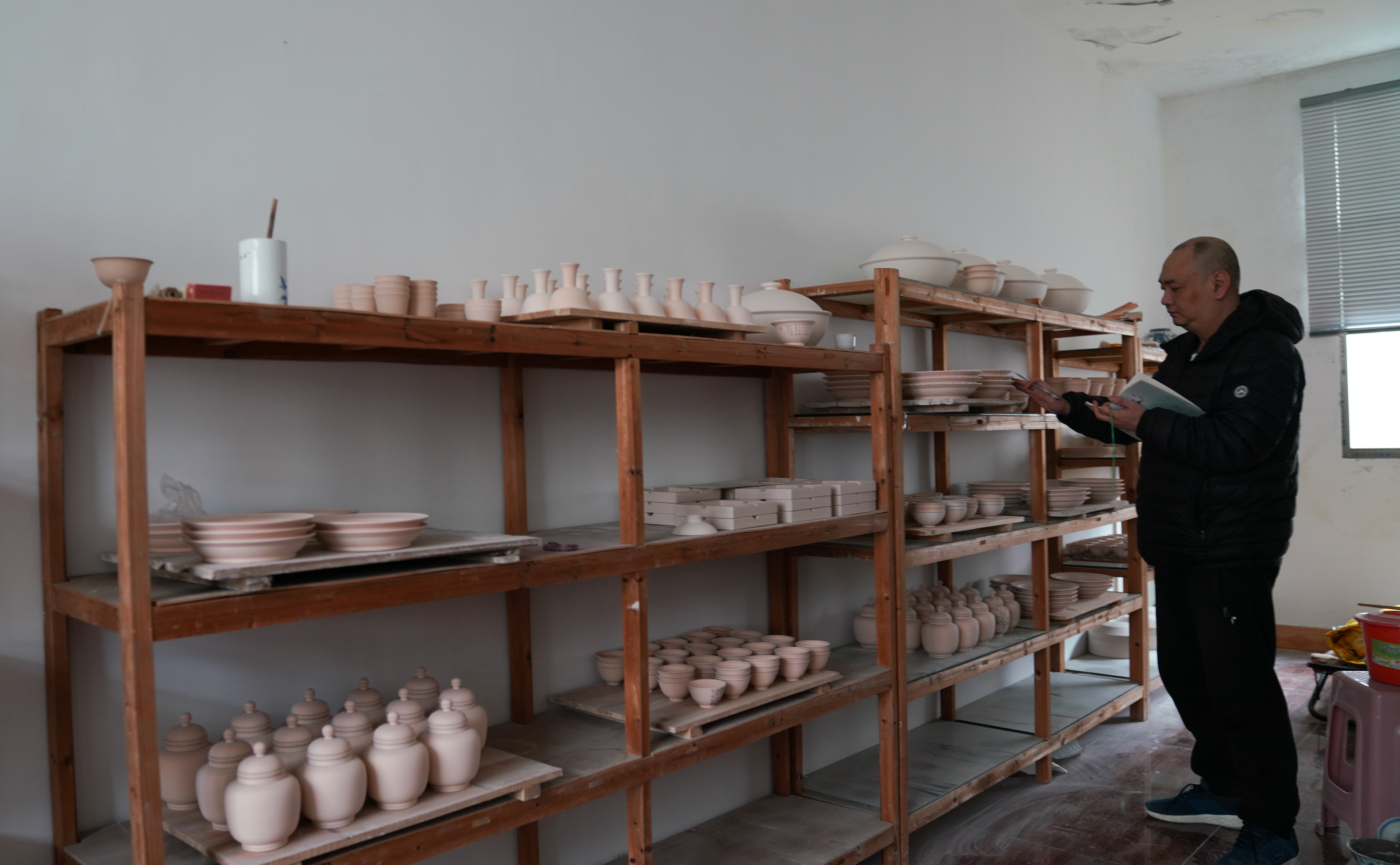 ↑12月23日,“快雪时晴”团队成员在工作室清点瓷坯。新华社记者 胡晨欢 摄