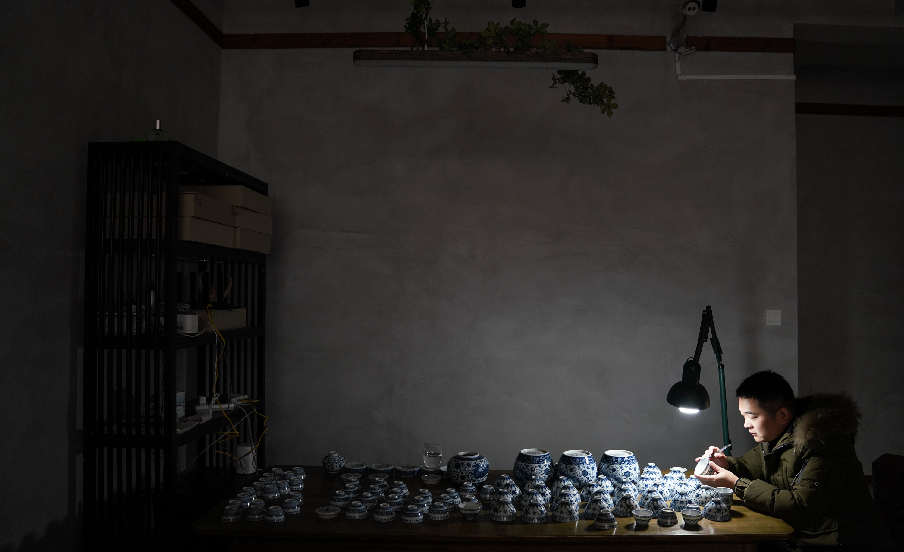 ↑12月23日,“快雪时晴”团队成员在工作室检测成品。新华社记者 胡晨欢 摄 在江西省景德镇市高新区,有一个名为“快雪时晴”的手工陶瓷制作团队,他们将青花、粉彩等多种陶瓷工艺融合,并加以创新,制成通透、纤薄的瓷碗和瓷杯。团队拥有10多个品种的产品,受到国内外消费者青睐。 团队负责人汪敏辉介绍,一只普通的青花茶杯,从成型到烧制成功,至少需经10多名工匠之手,不容任何一个环节出错,团队成员总是努力把手艺做到极致。
