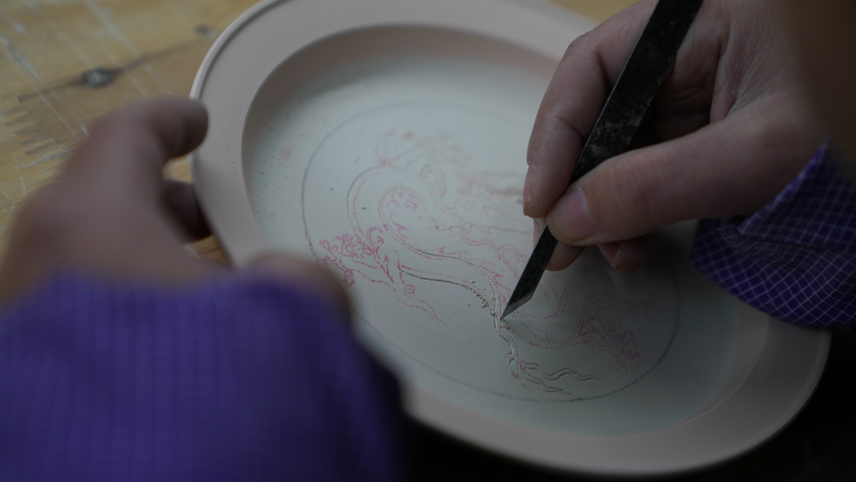 ↑12月23日,“快雪时晴”团队成员在工作室雕刻陶瓷。新华社记者 胡晨欢 摄