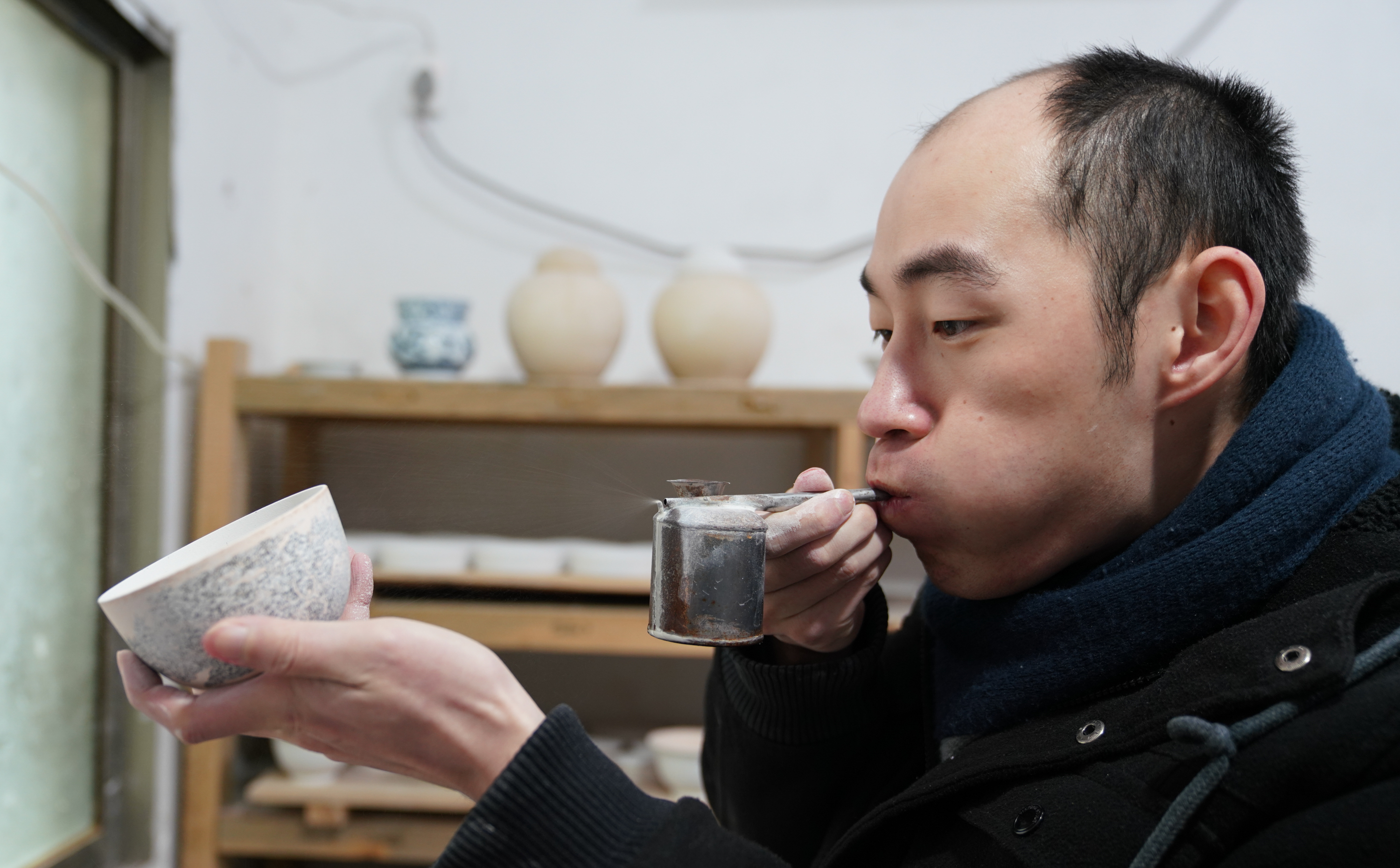 ↑12月23日,“快雪时晴”团队成员在工作室进行吹釉。新华社记者 胡晨欢 摄