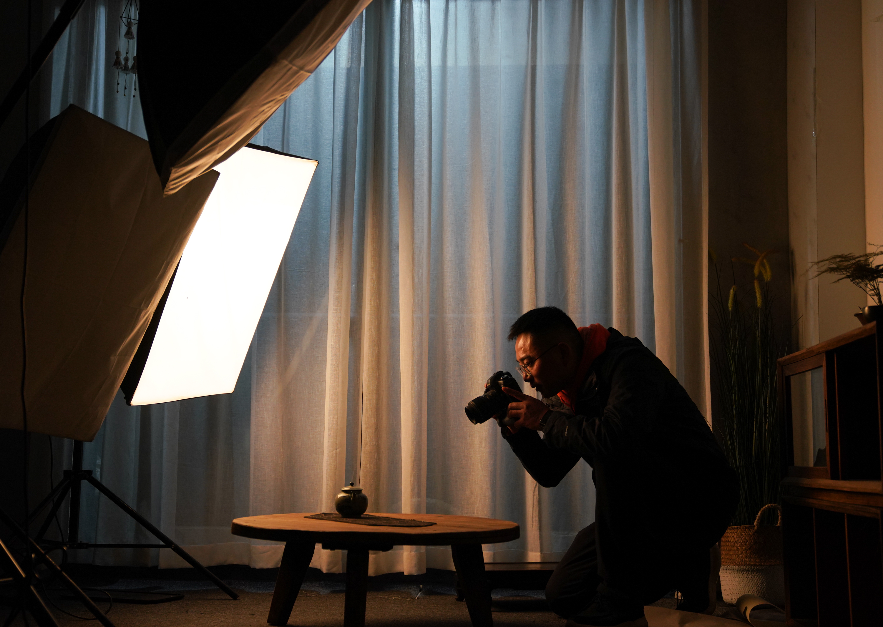 ↑12月22日,“快雪时晴”团队成员在工作室拍摄网络销售所需的产品图片。新华社记者 胡晨欢 摄