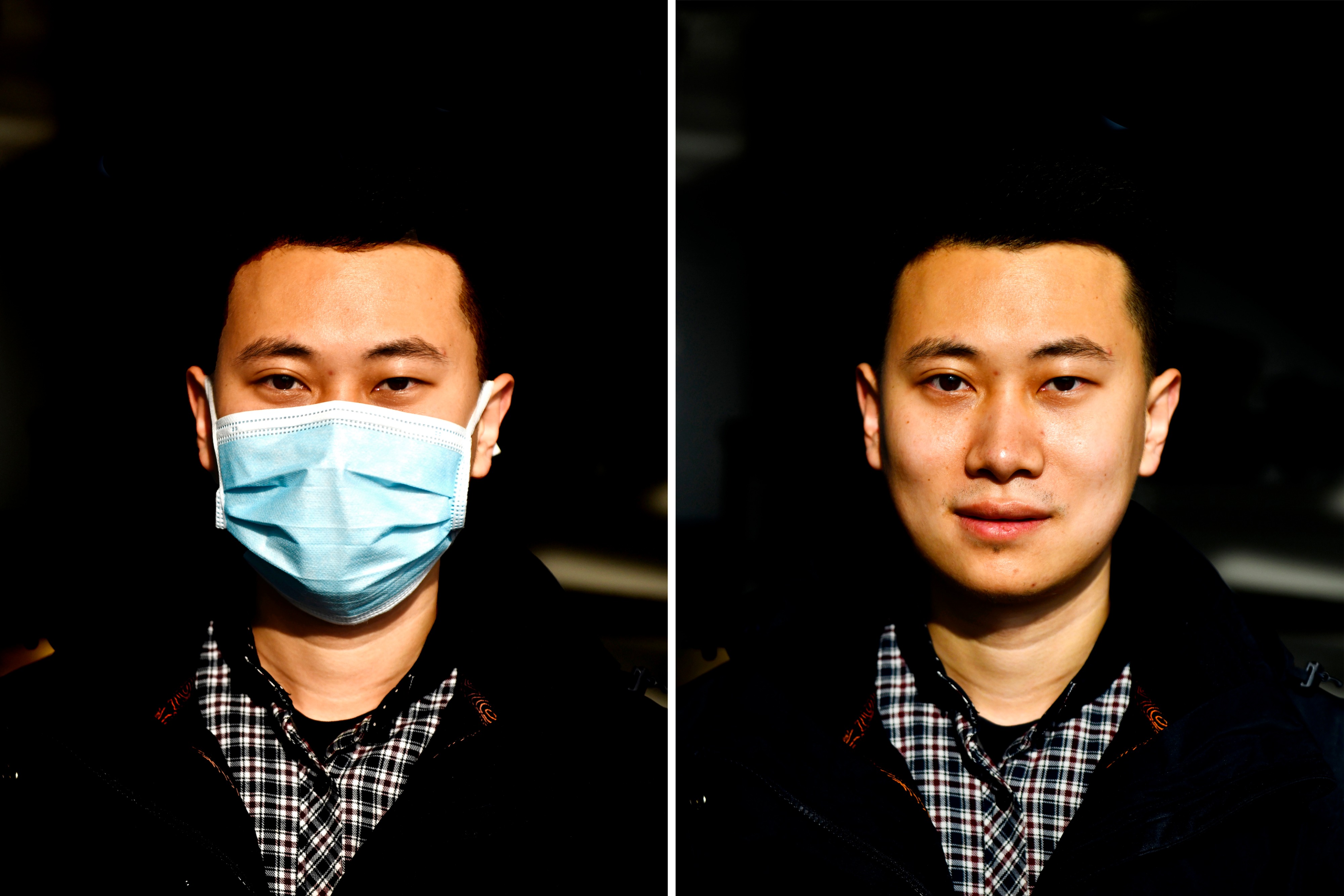 他习惯戴着医用口罩。黑色的棉夹克内有方格衬衫打底,卡其色的休闲裤配一双蓝色的运动鞋,显得既稳重又有朝气。