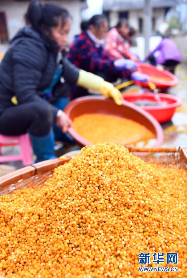 12月23日,在湖北省宣恩县晓关侗族乡兴合中药材产销专业合作社,村民在清洗黄精籽。