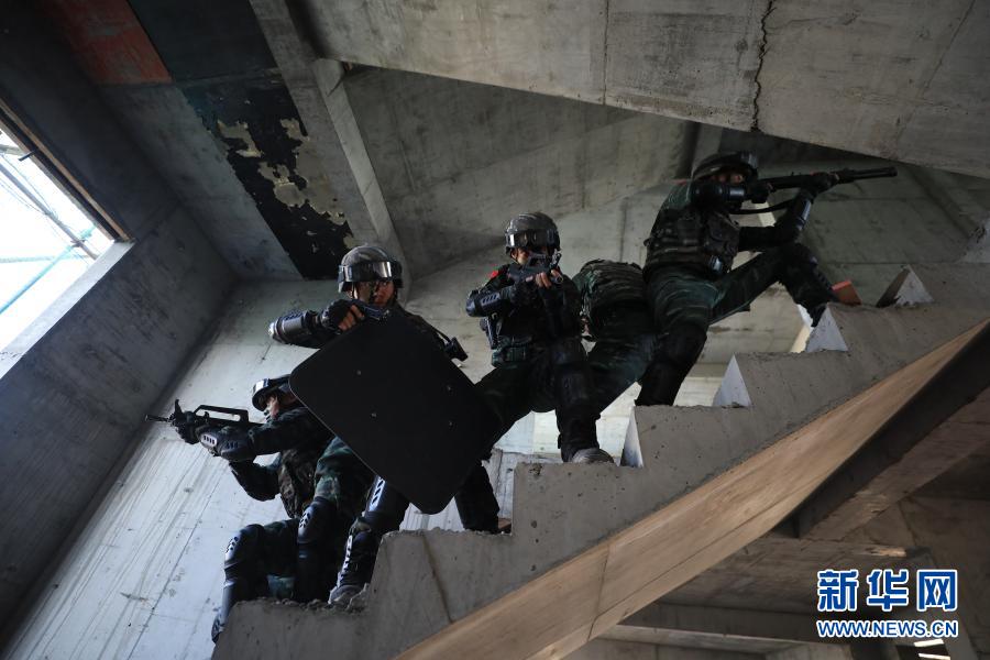 武警新疆总队某机动支队特战一中队开展模拟街区捕歼演练(9月20日摄)。新华社发 (张文 摄)
