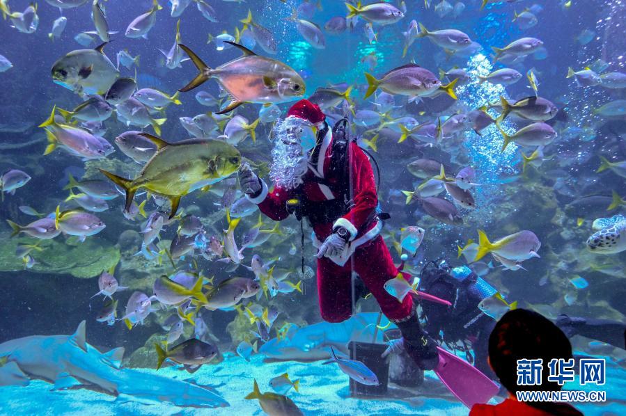 这家水族馆近日推出“圣诞老人”潜水表演,迎接圣诞节的到来。