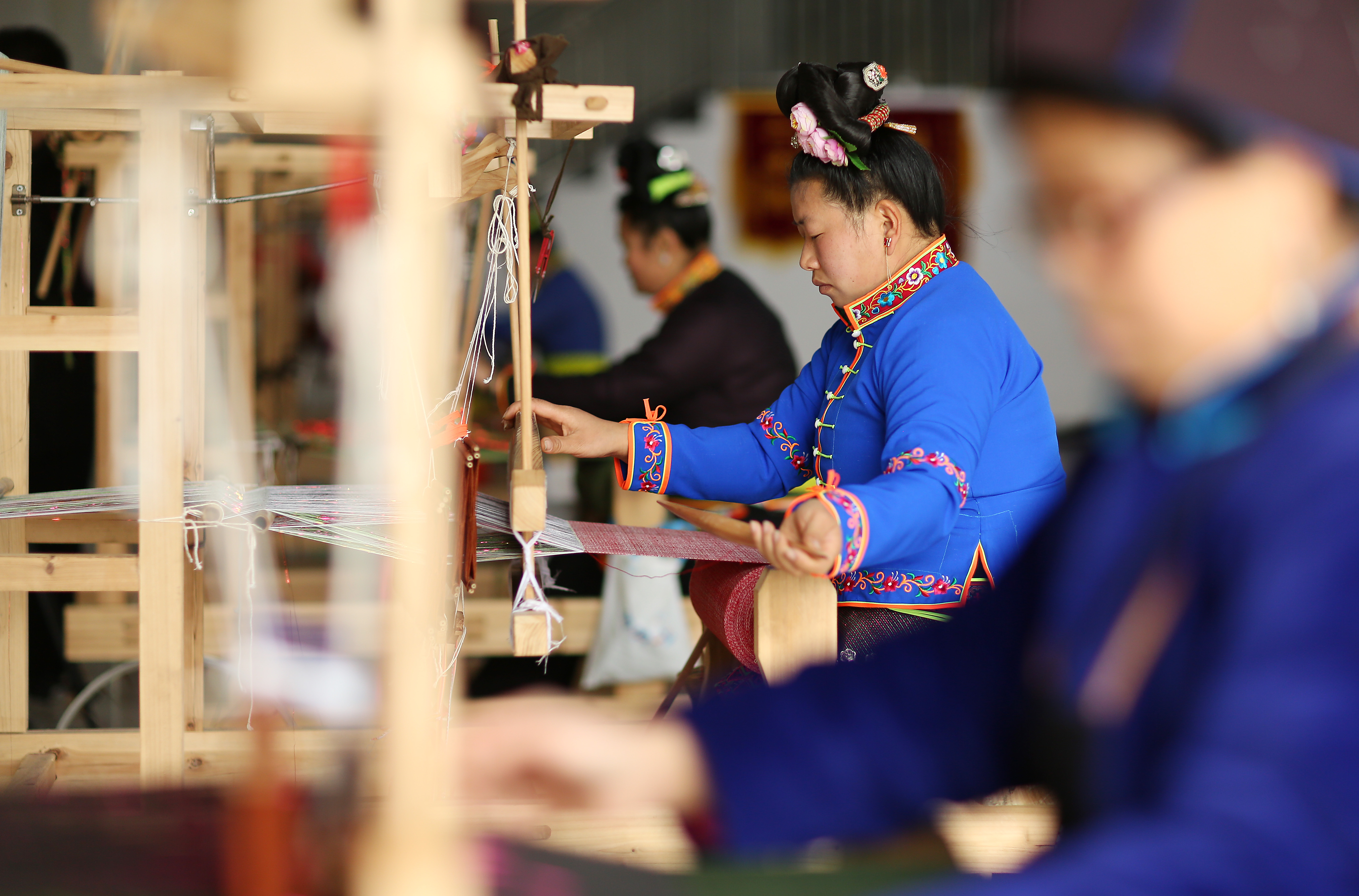 ↑12月23日,搬迁群众在贵州省丹寨县金泉街道易地扶贫搬迁安置点“扶贫微工厂”织布。