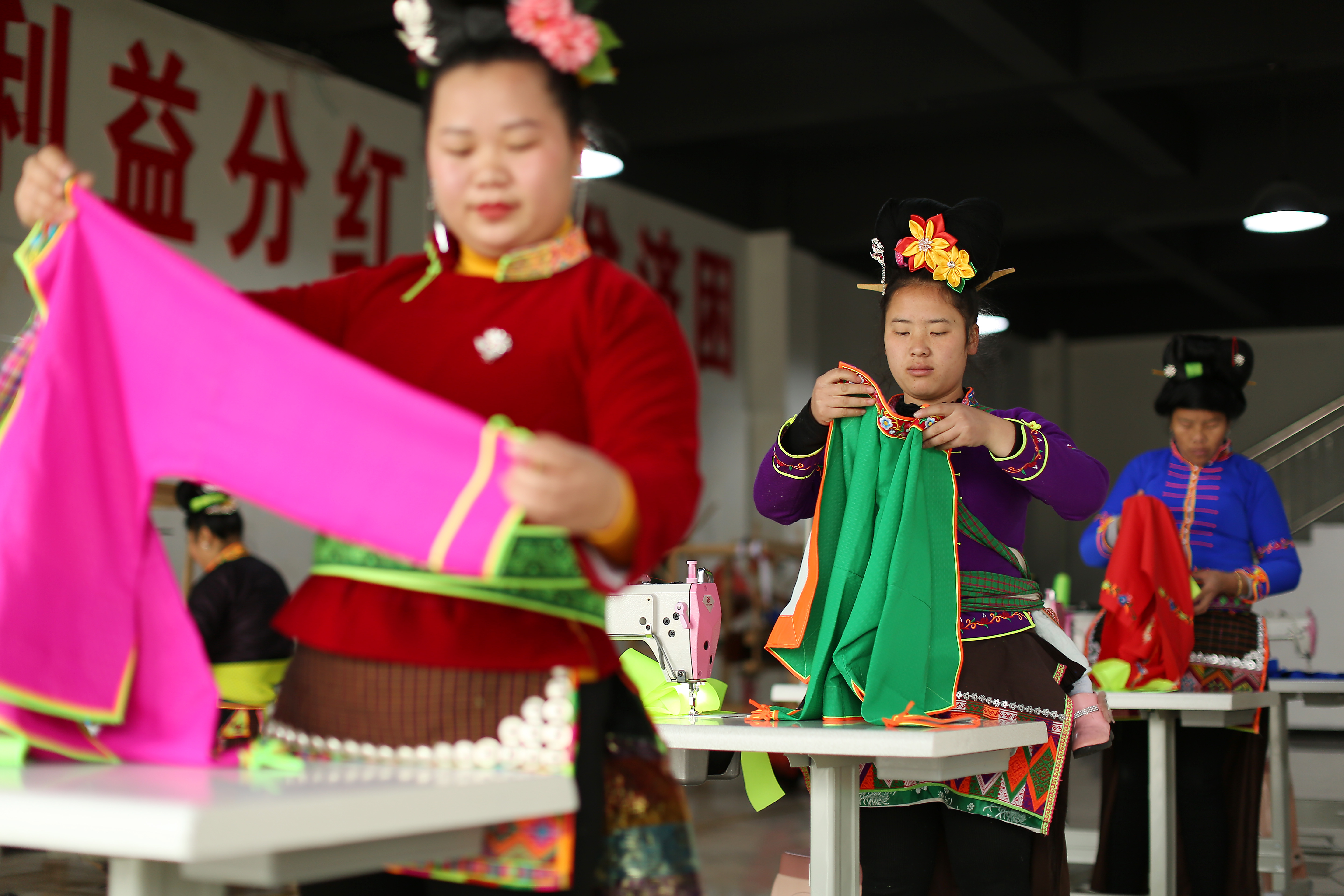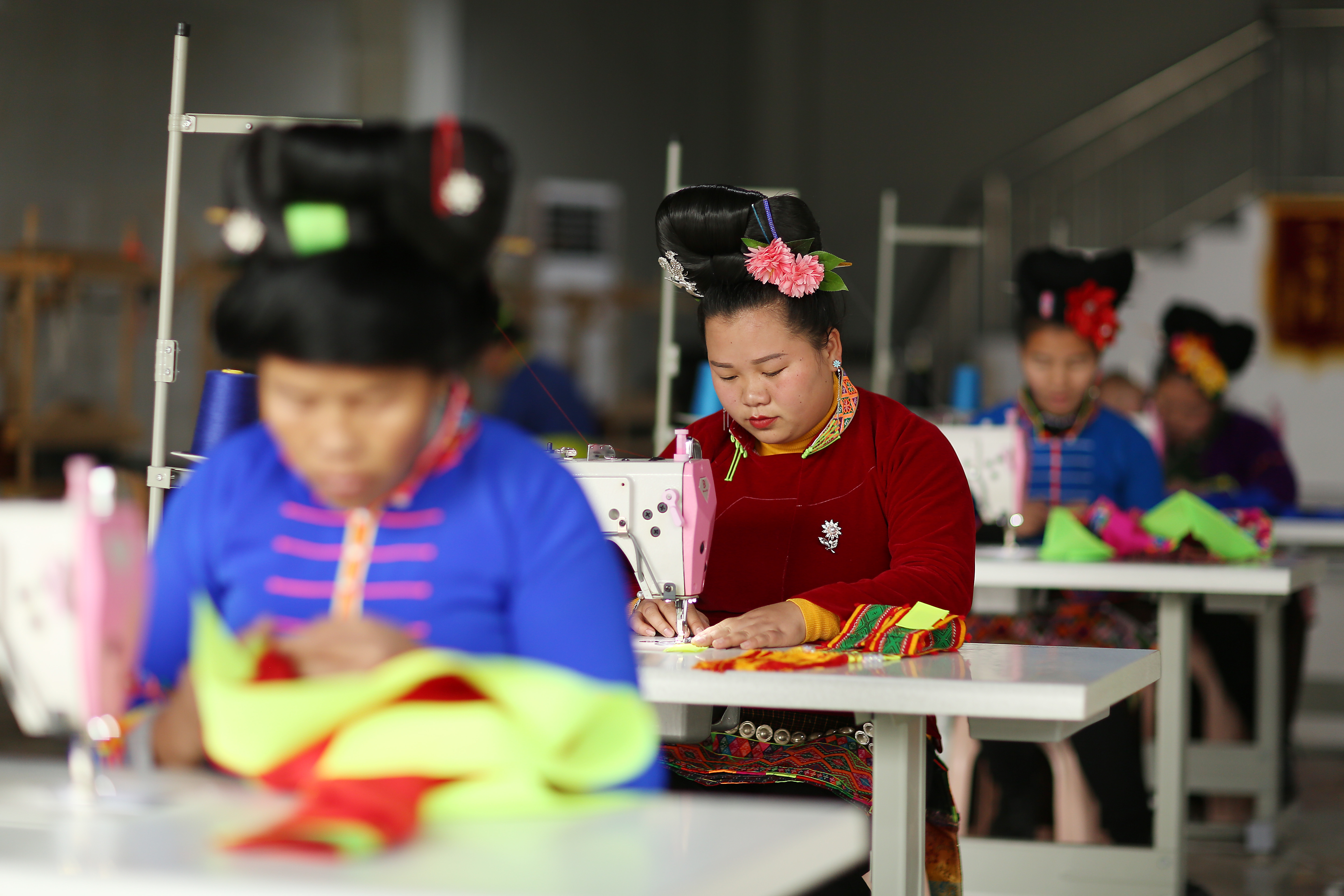 ↑12月23日,搬迁群众在贵州省丹寨县金泉街道易地扶贫搬迁安置点“扶贫微工厂”缝制传统苗族服饰。
