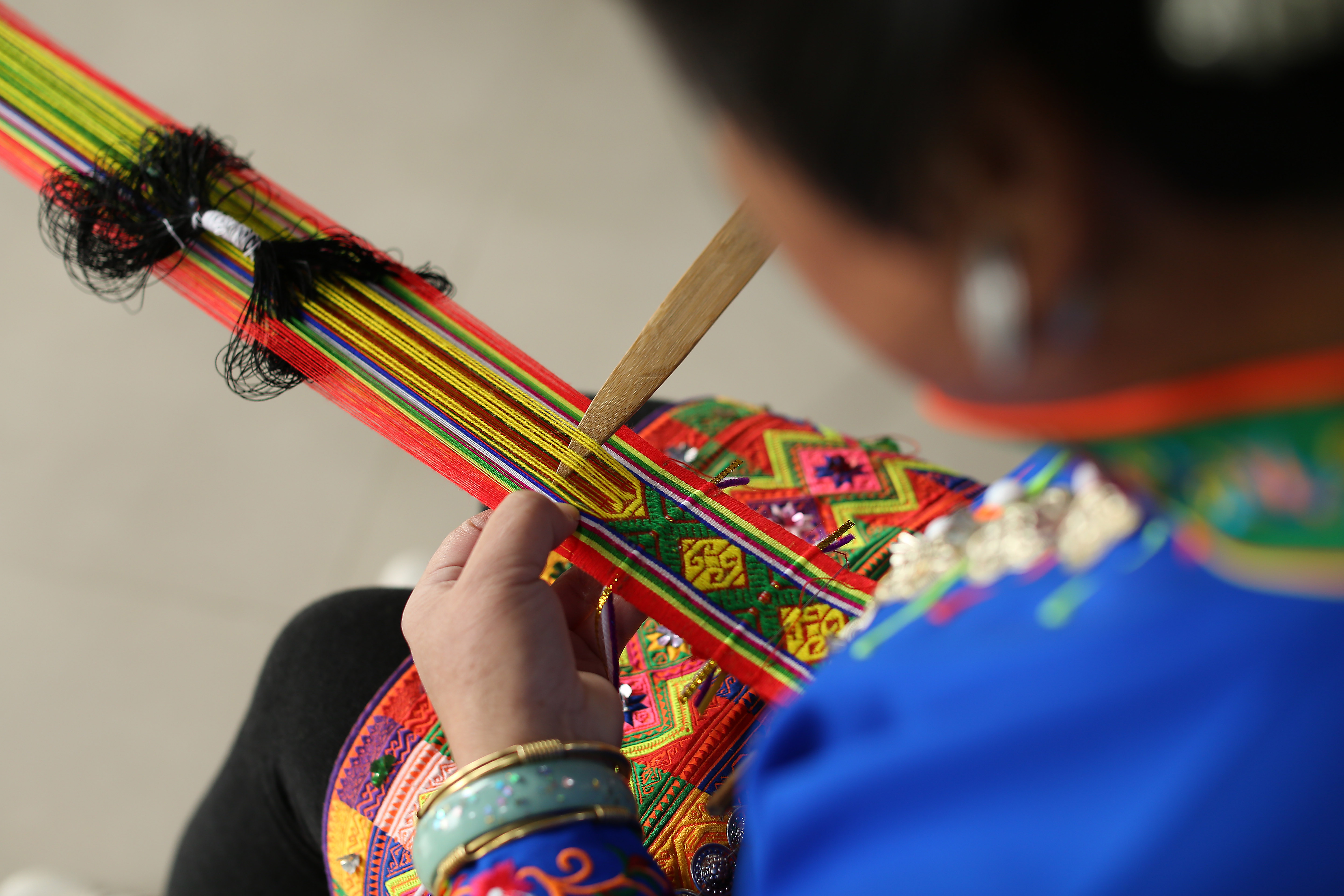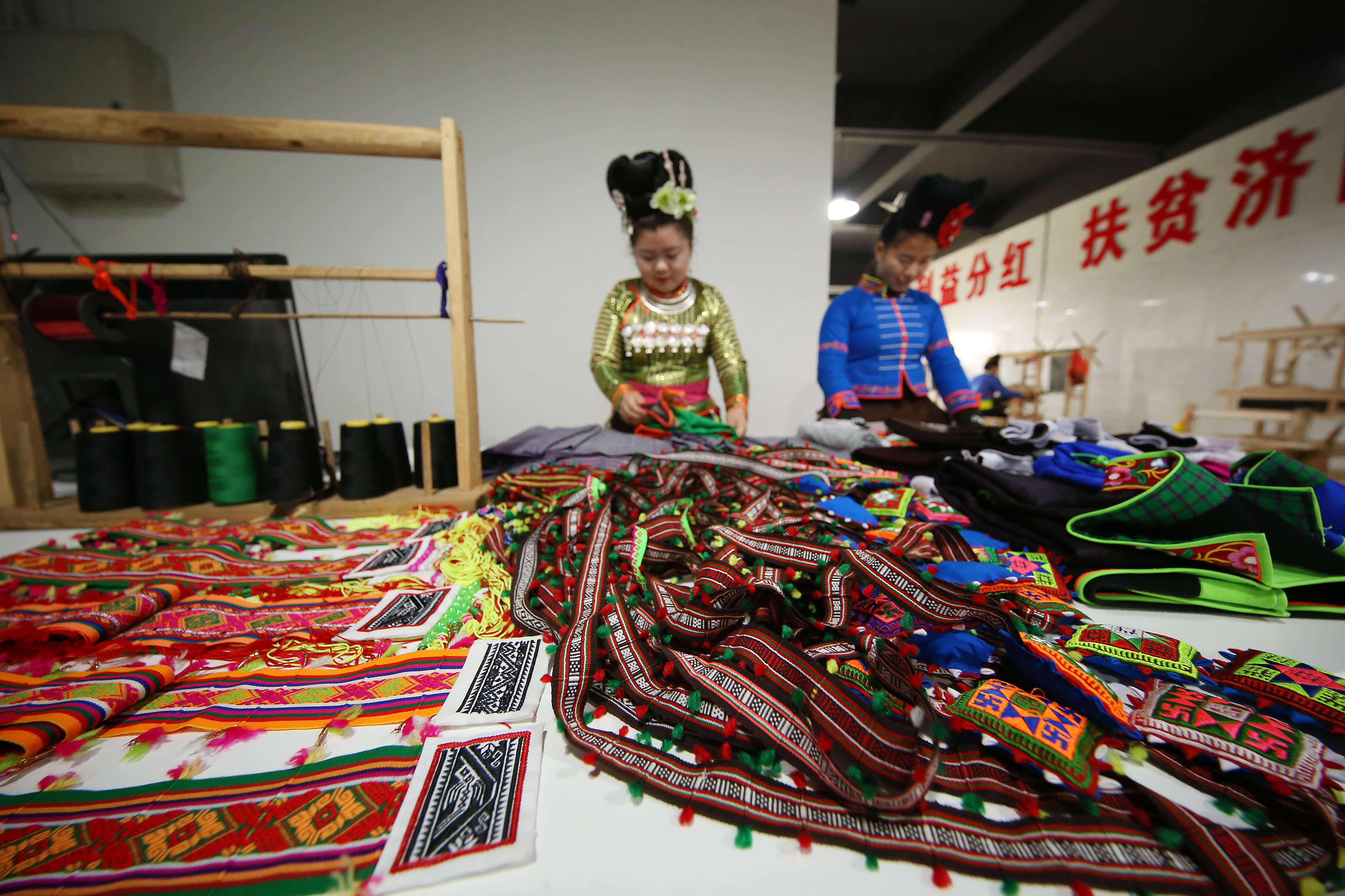 ↑12月23日,搬迁群众在贵州省丹寨县金泉街道易地扶贫搬迁安置点“扶贫微工厂”编织传统苗族服装饰带。