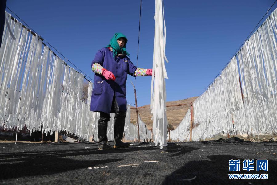 12月23日,甘肃省定西市安定区宁远镇红土村的村民在晾晒粉条。