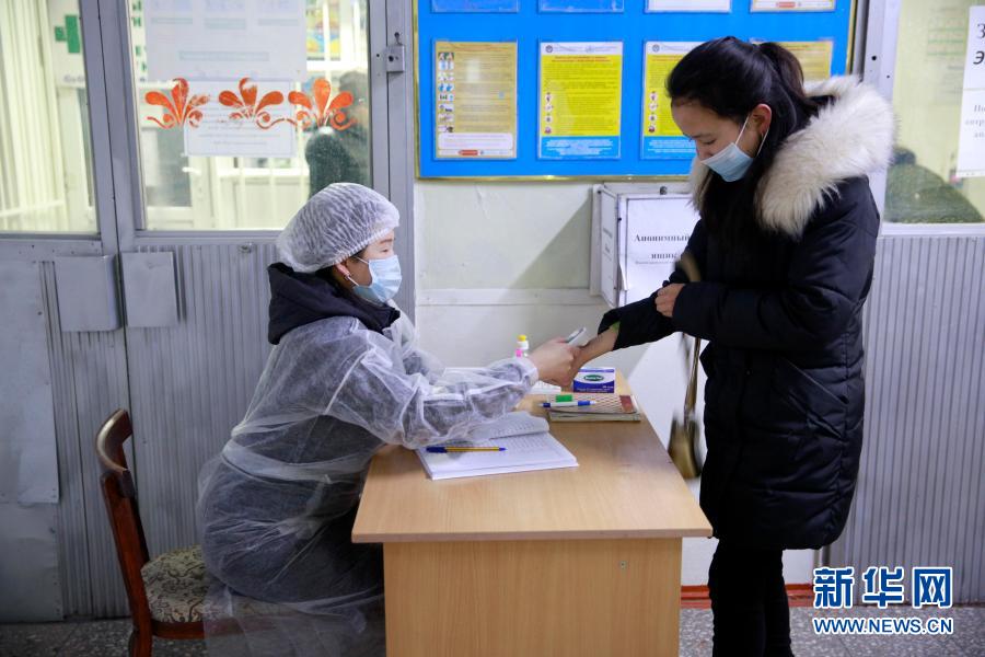 12月23日,在吉尔吉斯斯坦比什凯克,一名市民(右)到一家医药中心问诊时接受体温检测。